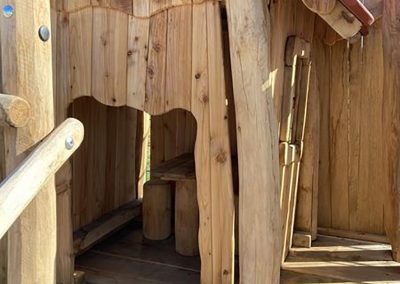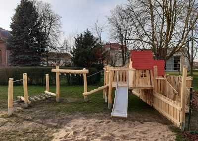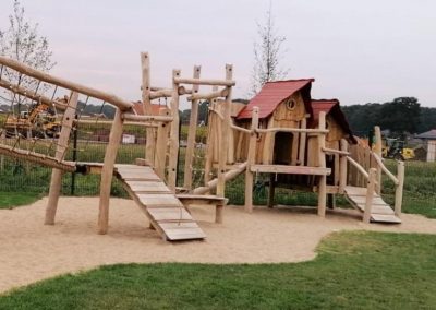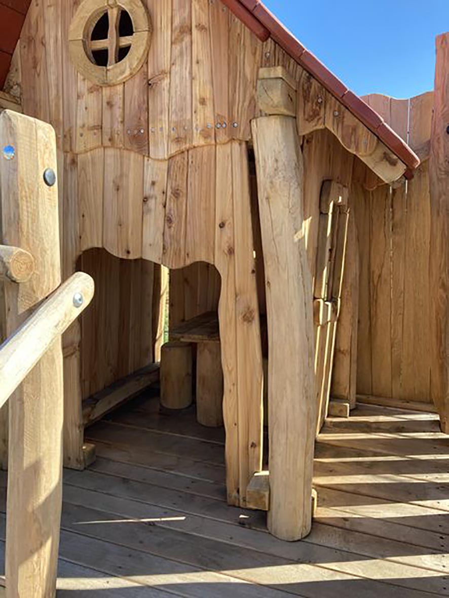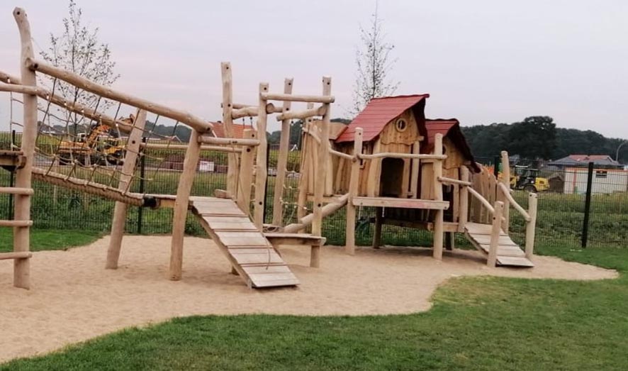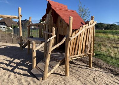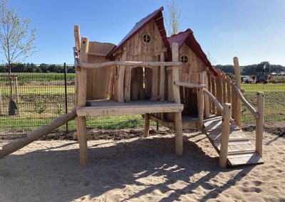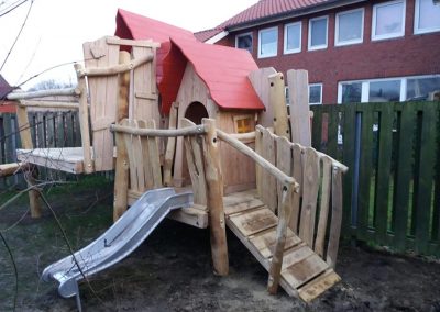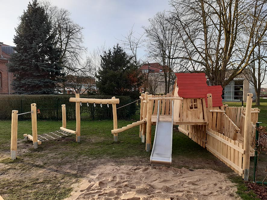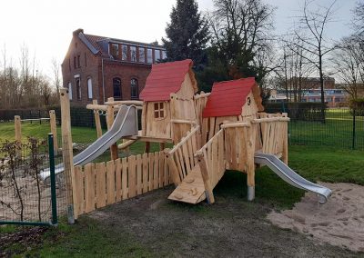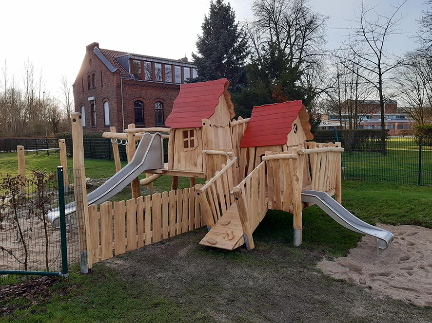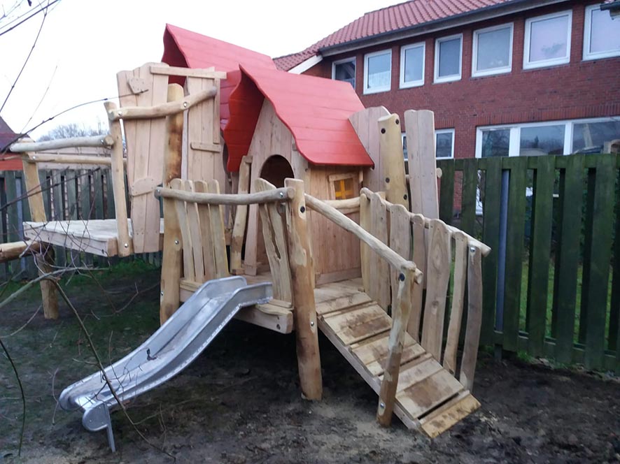 Eine Kombination aus zwei Spielhäusern mit Kletter- und Rutschelementen für Krippen- und Elementarkinder.